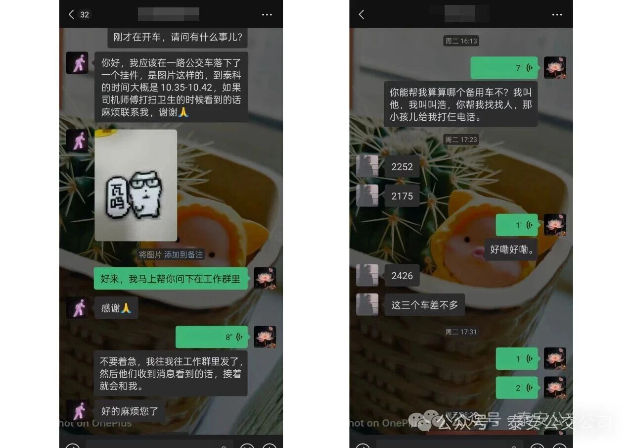前兩天,狄同學(xué)在乘坐1路公交車時,不慎將隨身攜帶掛件遺失。因掛件為朋友親手制作,紀(jì)念意義非常特殊,該學(xué)生焦急萬分,便通過公交1路泰科服務(wù)群發(fā)起求助,又聯(lián)系1路駕駛員劉俊芝幫助。正在終點(diǎn)站等待發(fā)車的劉俊芝看到消息后,第一時間將求助信息轉(zhuǎn)發(fā)至線路工作群協(xié)同尋找,同時,又與在終點(diǎn)等待發(fā)車的駕駛員王杰一起分析排查狄同學(xué)所乘坐的車輛。經(jīng)初步排查,這位同學(xué)所乘坐的公交車可能已被線路同事?lián)Q下,在天池公交停車場補(bǔ)電。